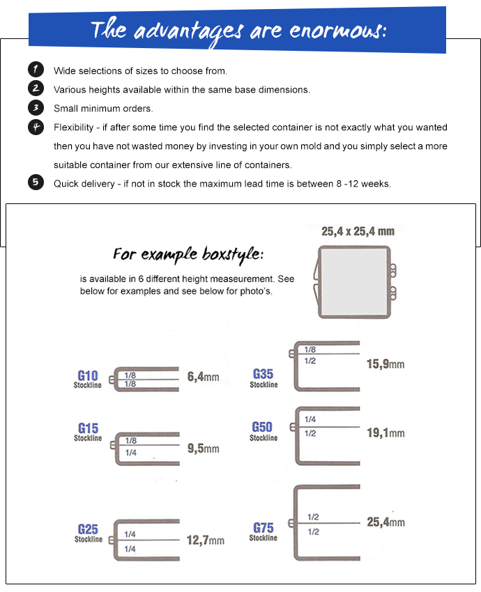 Rather then inventing the wheel and making molds for your own box, why not select one of our readily available containers from our stock collection of crystal clear injection moulded plastic boxes.